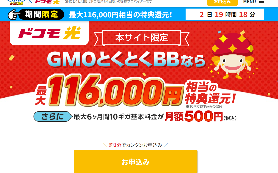 さらに、GMOとくとくBB側ではホームページ限定特典として最大86,000円キャッシュバック、10ギガ申込み時の追加キャッシュバック、dカード申込み時の特典などが案内されています。ただし、特典には申込み経路や受取手続きなどの条件があるため、金額だけで判断せず、適用条件を確認したうえで比較したいところです。